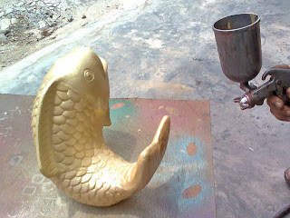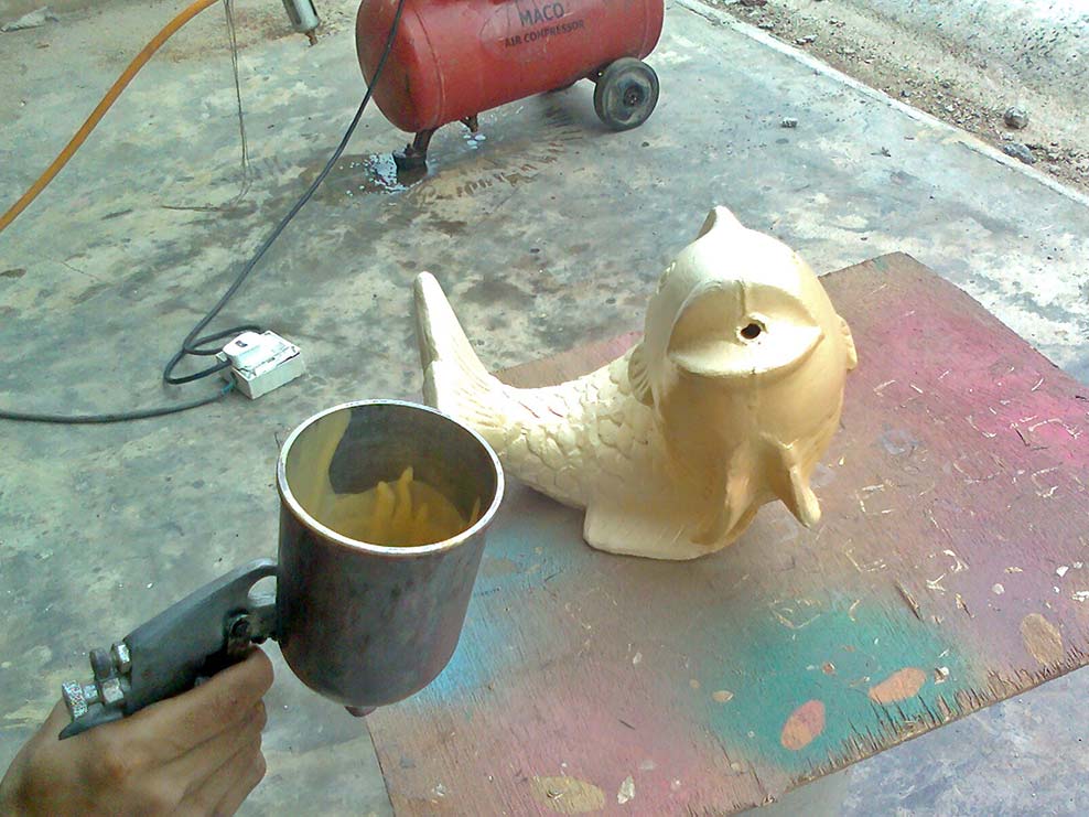 After the base coat is dried (Pearlescent Gold Paint C200), stipple small patches of CRO. Tone Patina Finishing (P65 whitish color) onto the whole surface lightly with the tip of a brush. And after it's dried, we use the brush again to color some part of the koi fish in red (P73).